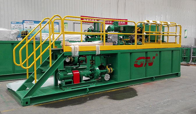 本套系統分為2個階段的固控處理和一套泥漿配置混合系統。鉆井泥漿初步分離采用的是冠能GNZS752型振動篩,200GPM的處理能力、兩片篩網的構造用來處理鉆井泥漿中的大顆粒的固體。振動篩處理后的液體通過離心泵輸送給迷你型的沉降離心機GNLW223進一步處理,可達3800RPM的轉速,分離的固體顆??蛇_到2個微米。